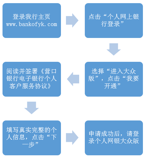 持有營口銀行卡或存折的客戶,可以通過任意一臺連接Internet的電腦登錄www.meyou0805.com自助注冊營口銀行個人網(wǎng)上銀行大眾版,具體操作流程如下: ![]() |